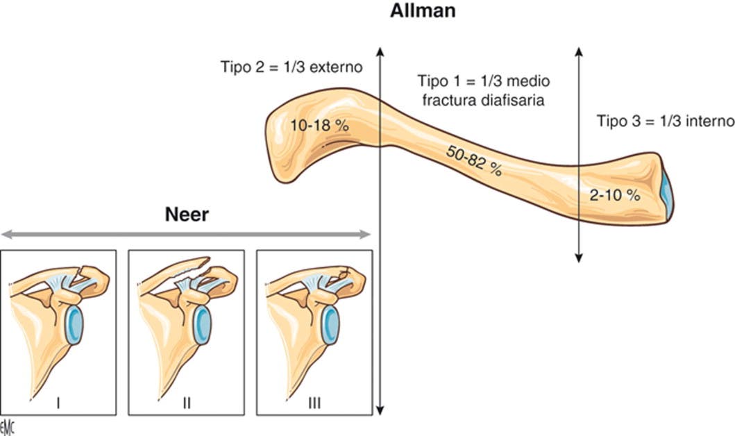 Apresentação Clínica. A avaliação de uma fratura da clavícula depende da situação clínica, no entanto, a maioria corresponde a uma fratura clássica do eixo médio, ou seja, do grupo I. Quando esta ocorre no contexto de um trauma de alta energia, os doentes podem necessitar de uma avaliação e tratamento simultâneos conforme o método de Suporte Avançado de Vida no Trauma (ATLS.